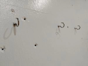 どのような経緯でこんなに穴が開いているのかは私もわかりませんが、これを逆に上手く利用してフックを差し込み自由に装飾可能にしました。