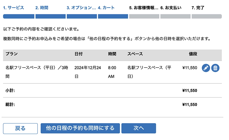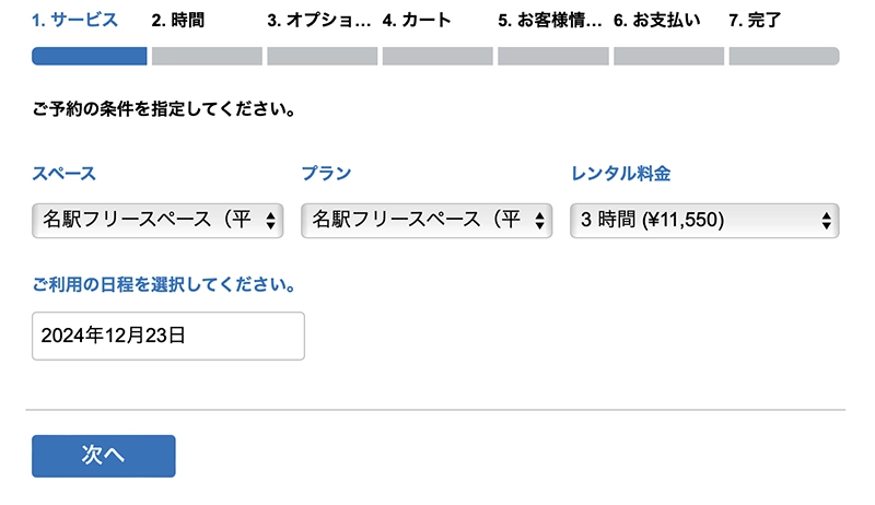 こちらの画面から、「プラン」にて、ご希望のご利用時間を選択してください。