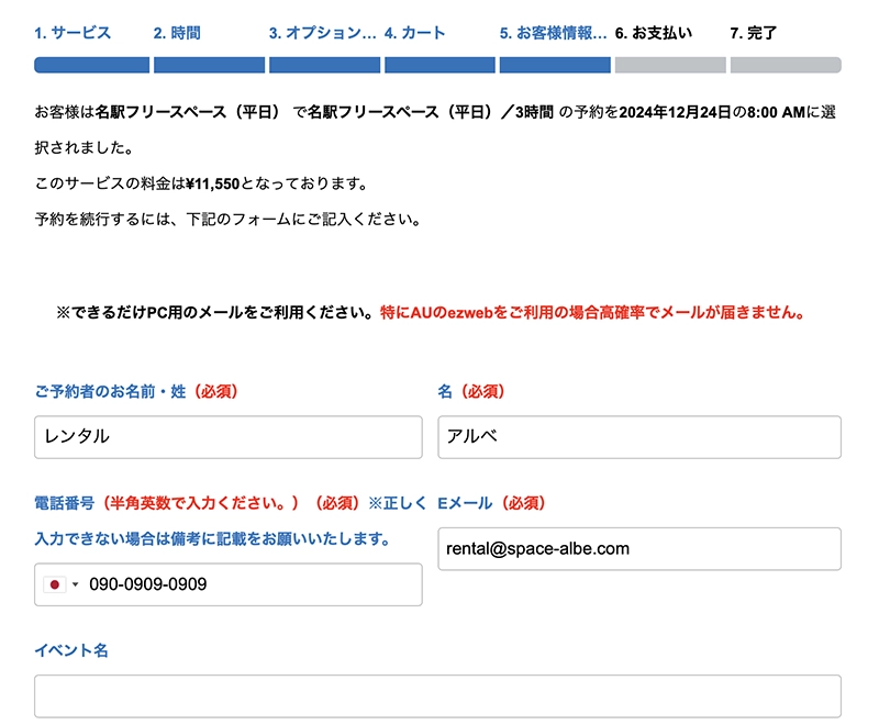 ・メールアドレスは確認のできるものを入力してください。記載いただいたアドレス宛にご予約確認メールや請求書、領収書などをお送りいたします。