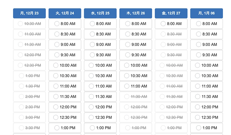 空き状況は週で見ていただくとわかりやすいです。