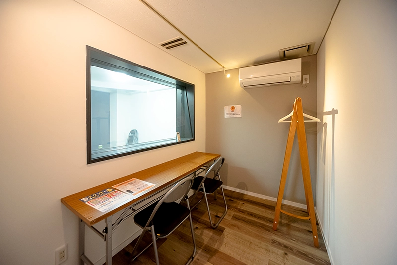 動線もシンプルで、演奏者が移動しても狭さを感じにくい構造です。ブース側を録音用に使ったり、別パートの練習に充てるなど、柔軟な使い方もできます。名古屋市内で少人数セッションを行いたい場合に、利便性と快適さを両立した空間といえます。