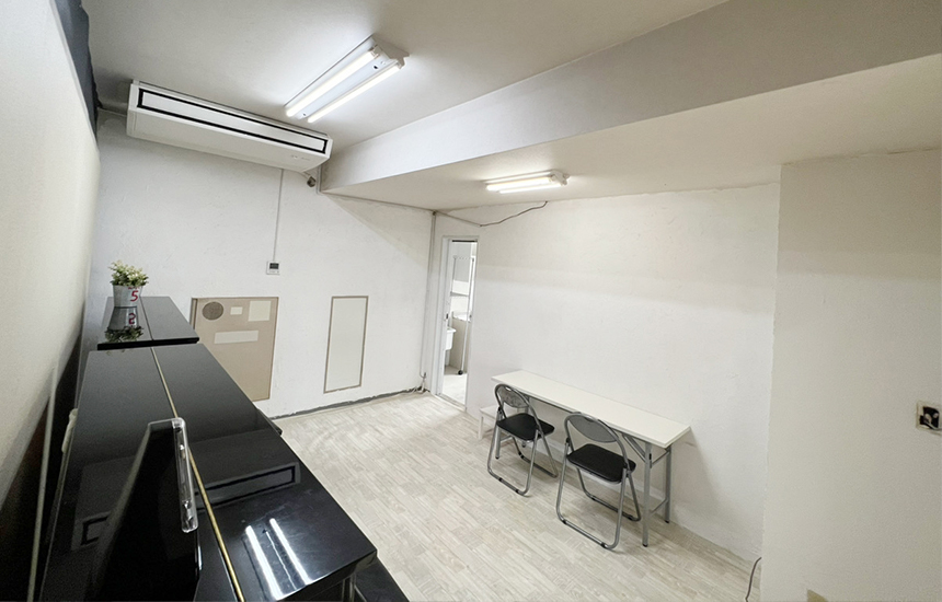「防音室」ではなく「練習室」です。隣接する防音室Aやエクササイズスペースなど外からの音はある程度入ってきます。