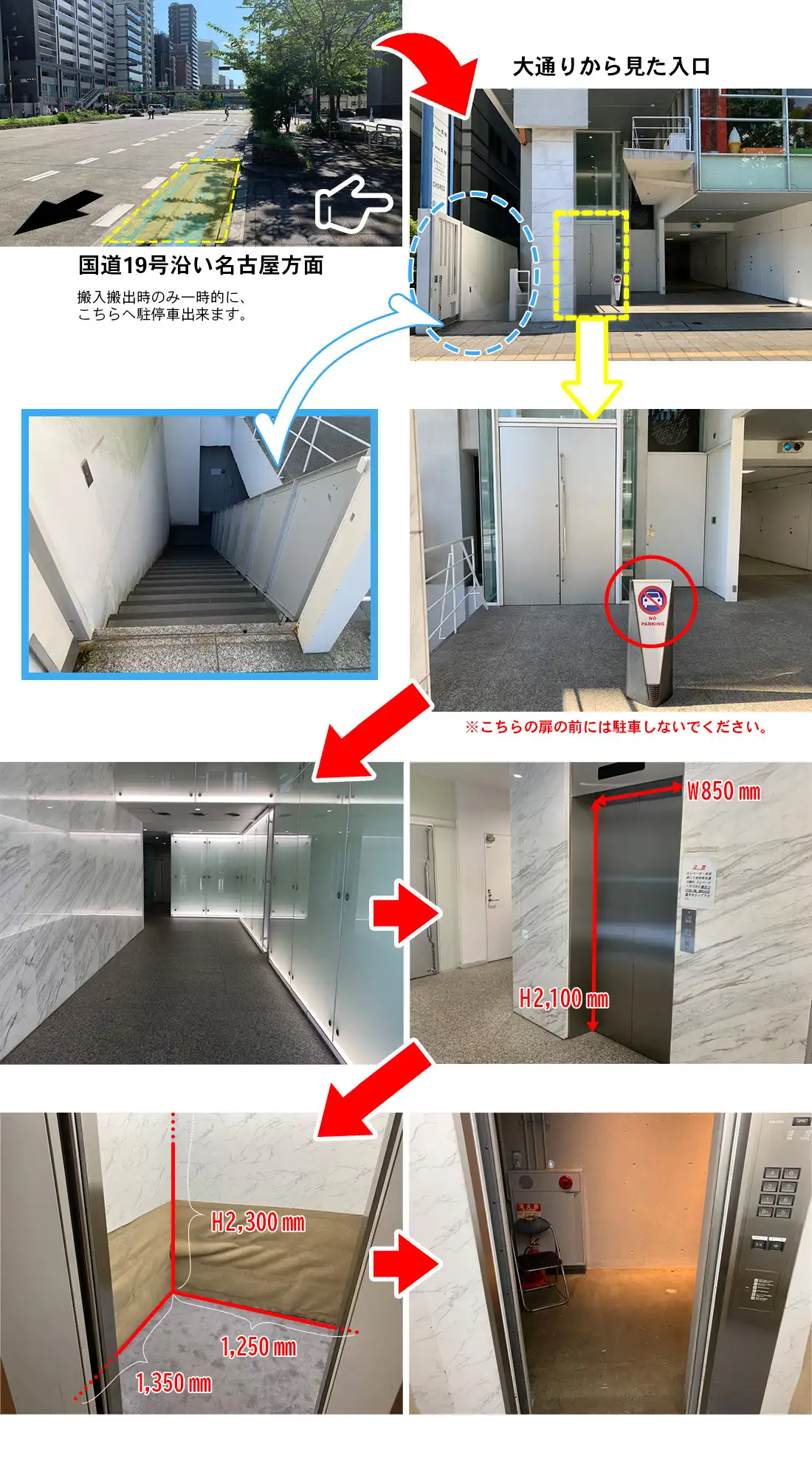 ・搬入、搬出の際にビルの真正面に駐車するのはご遠慮ください。ビルから少し下がったところに駐車いただくことは可能です。(搬入搬出以外での長時間の駐車はご遠慮ください。)