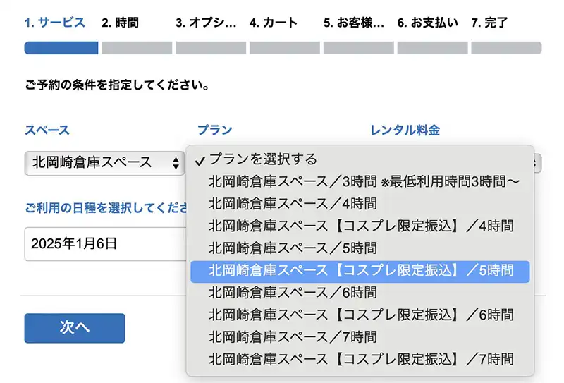 2. ご予約お申込みのガイダンスに従い「時間-コスプレ限定振込」にてご予約お申込み下さい
