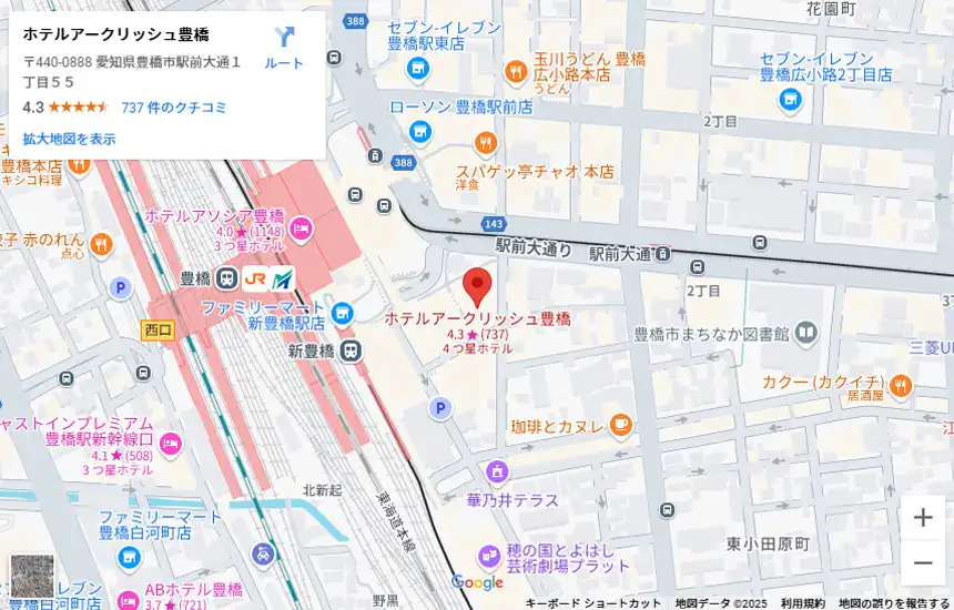 - 住所 愛知県豊橋市駅前大通1丁目55番地(ホテルアークリッシュ豊橋内)